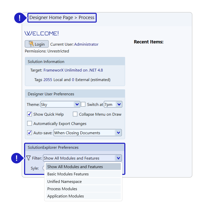 The Designer home page is the entry point when you design a solution using the software platform. You can navigate back to that page using the HOME icon in the top-left area.