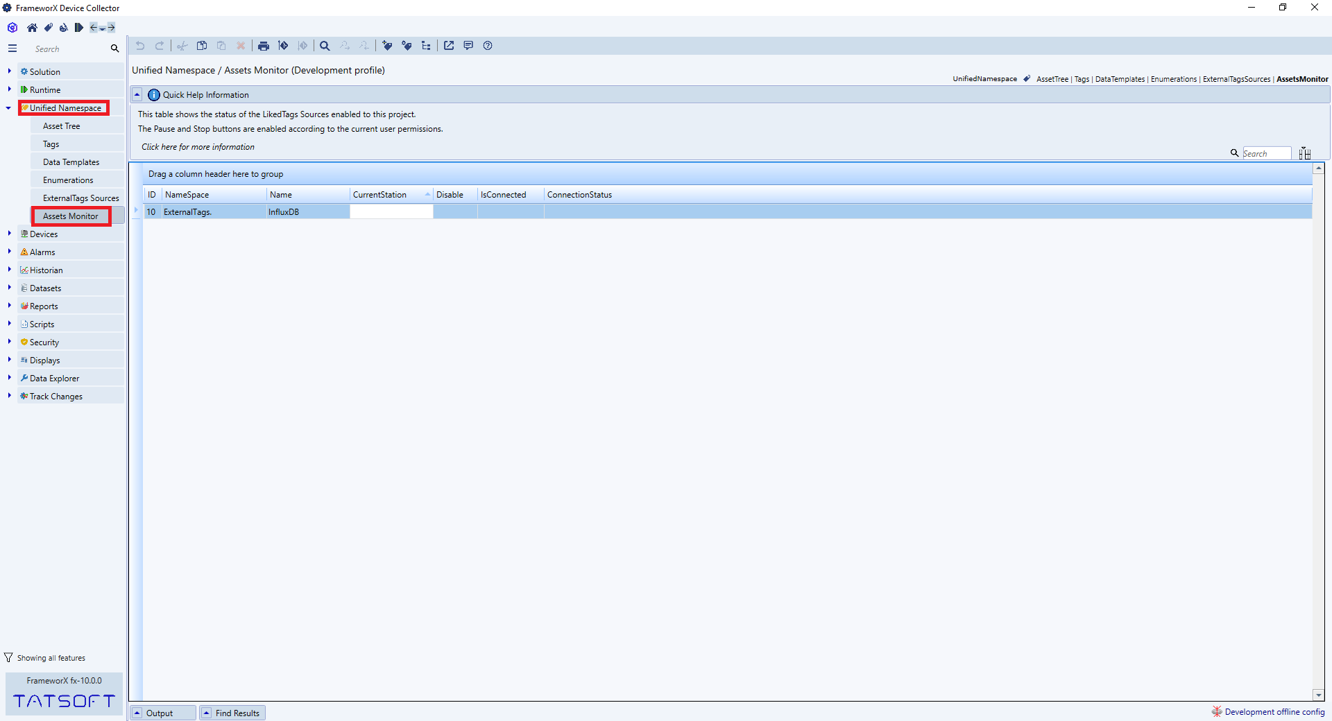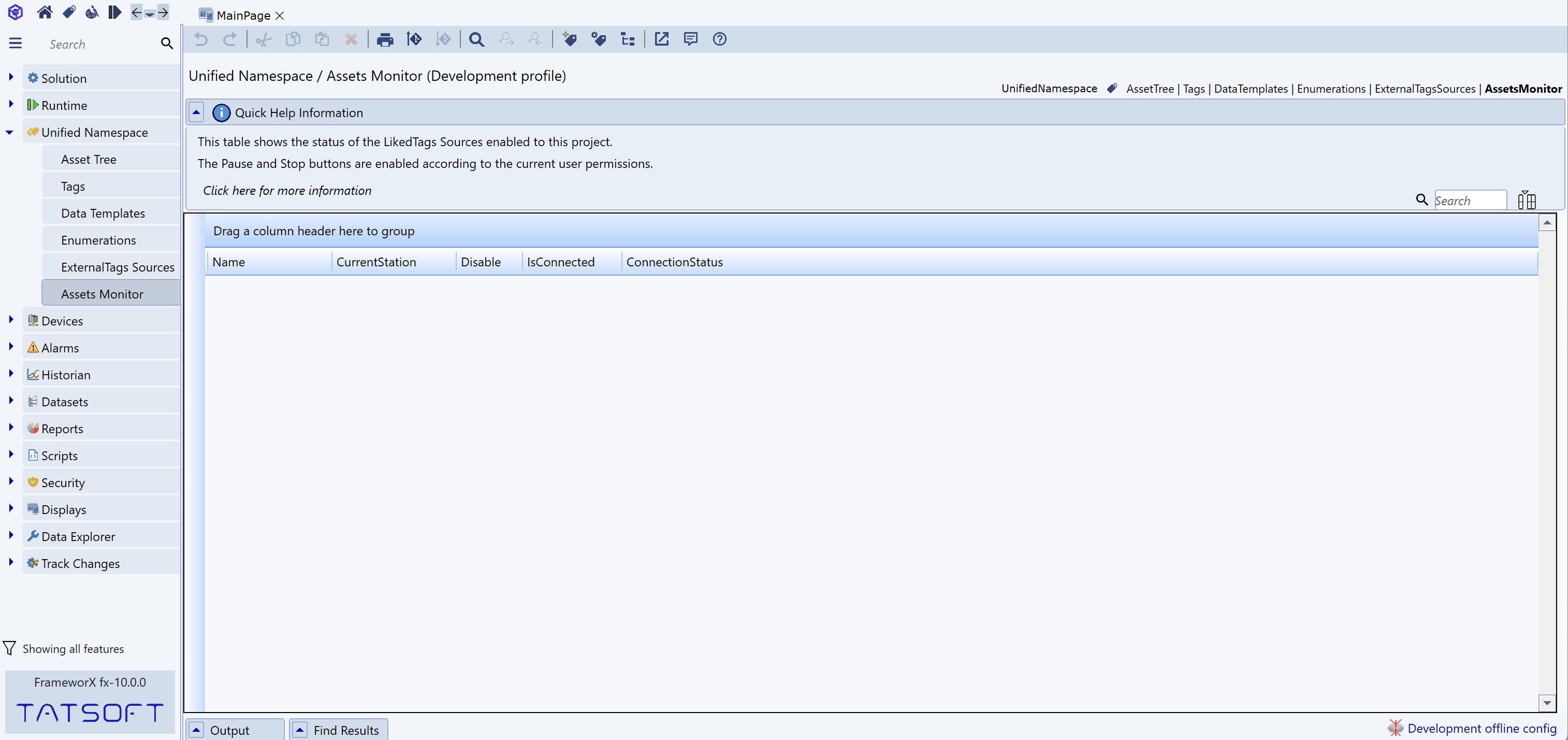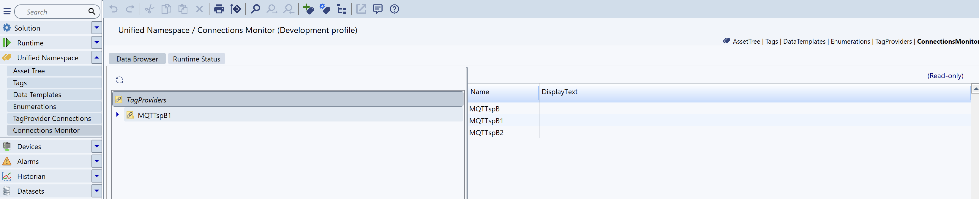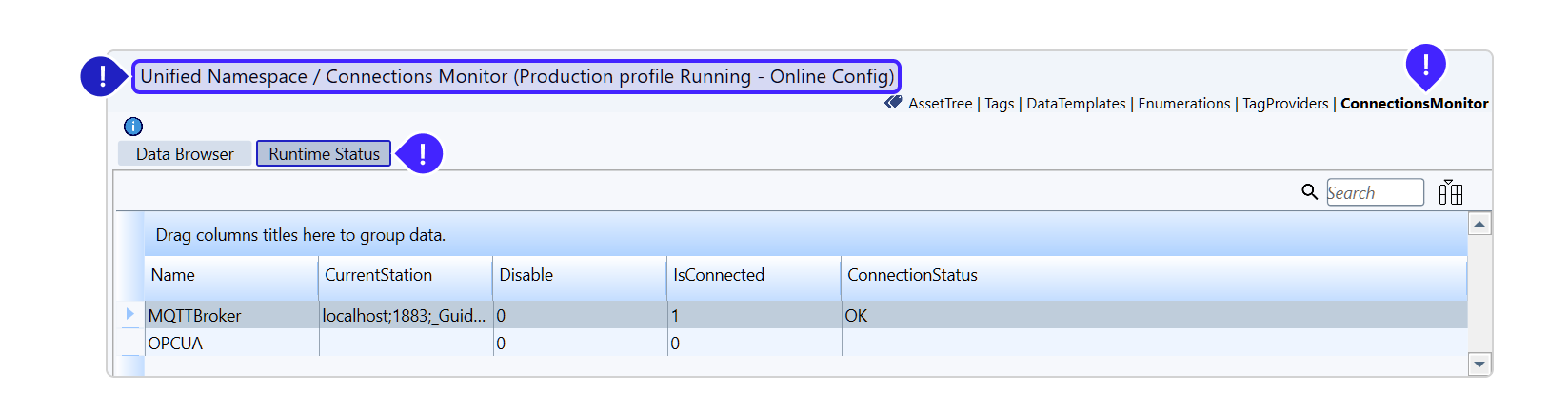 FrameworX. Solution Designer. Unified Namespace. Connections Monitor. Runtime Status.png